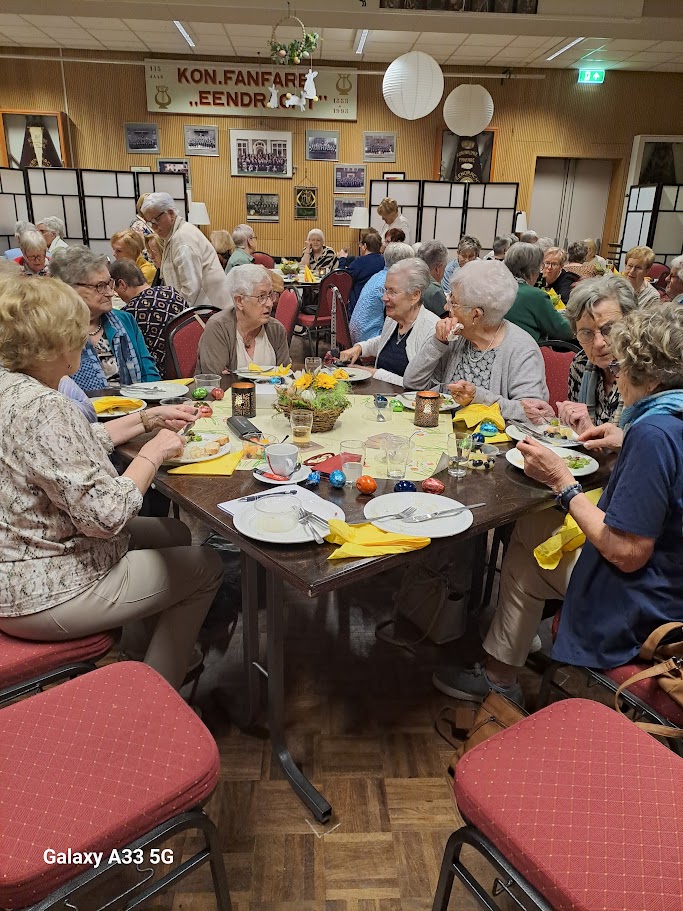 Ook dit jaar weer de traditionele, feestelijke Paasbrunch. Doordat de ledenvergadering is vervallen zetten we onze jubilarissen tijdens de Paasbrunch in het zonnetje. We huldigen Gerda Bisschops met haar 65 jarig lidmaatschap, Margriet Erens 40 jaar en Marleen Haan 25 jaar lid.