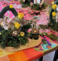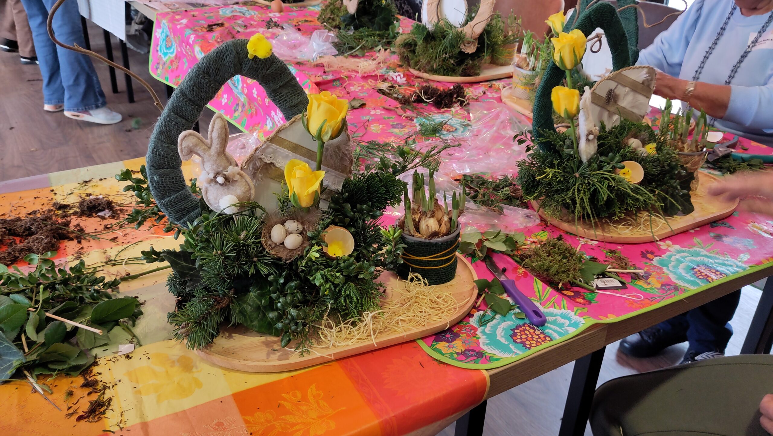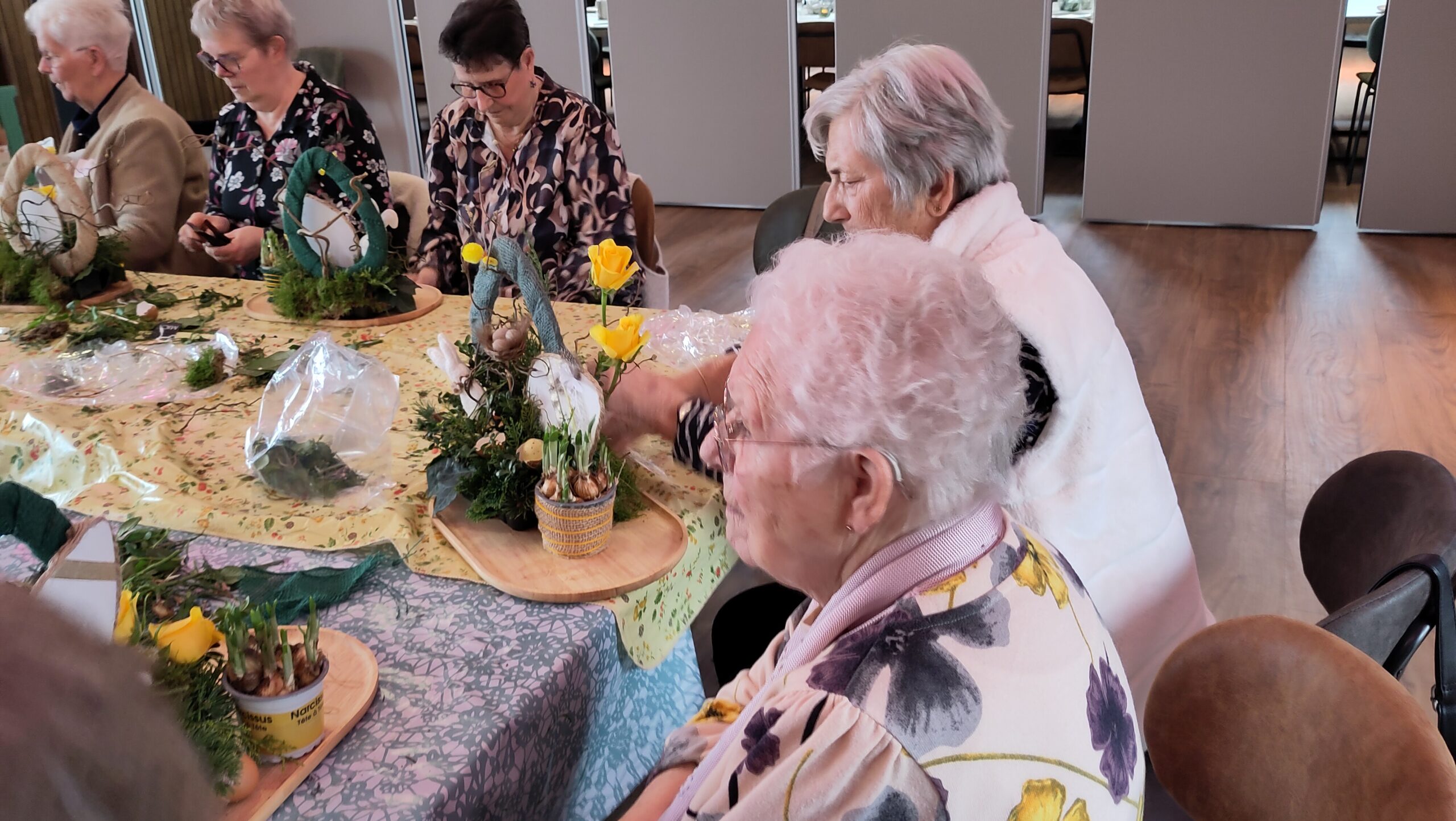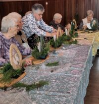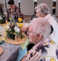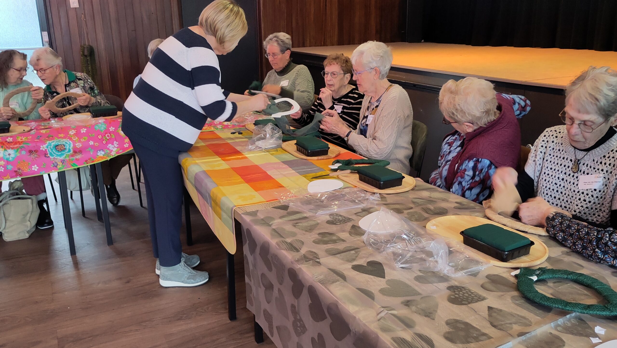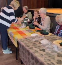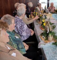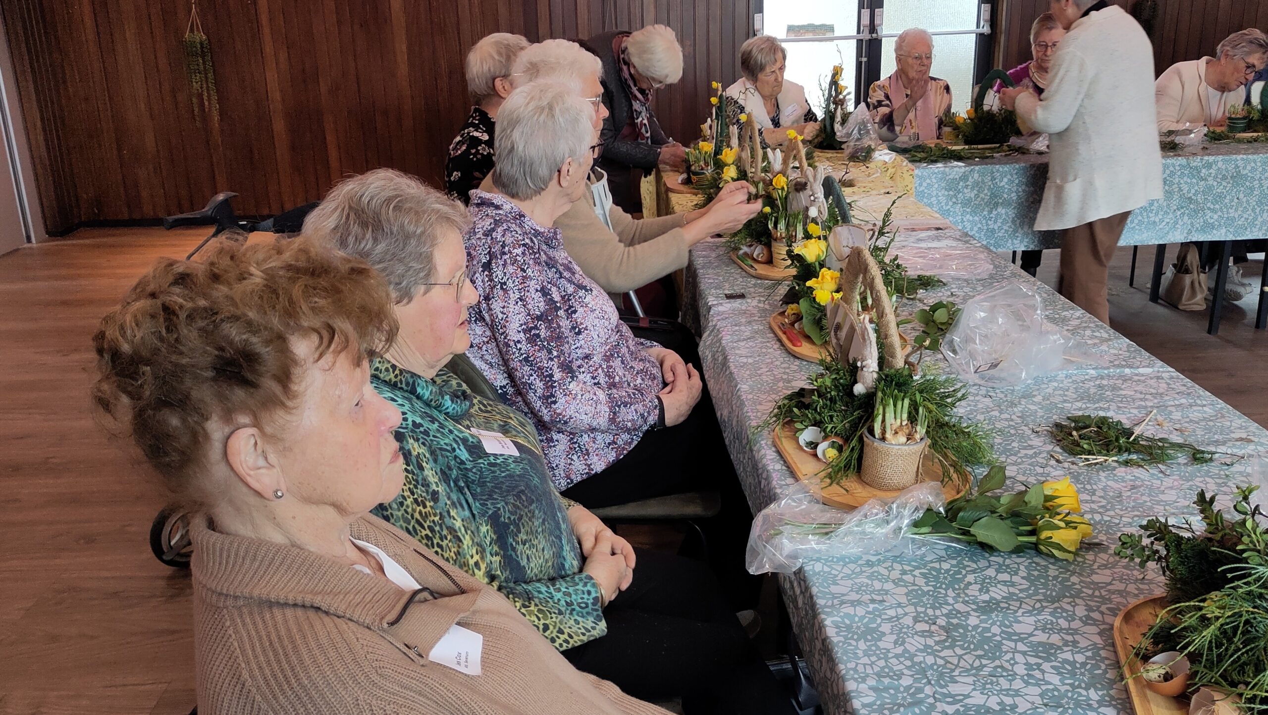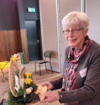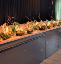 Een fijne dag, beginnend met koffie en vlaai. Daarna aan de slag, want er wordt een paasstuk gemaakt. Aan lange tafels in d’n Oesterham werd had gewerkt, onder deskundige begeleiding van Rieky en Truus. Als alles naar tevredenheid is afgemaakt, en alle stukjes naast elkaar op het podium staan, is het tijd voor de lunch. Ook deze keer weer heerlijk klaargemaakt door de dames van d’n Oesterham, met voor-, hoofd-, en nagerecht, inclusief mini-worstebroodjes!