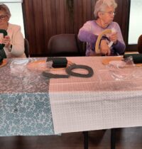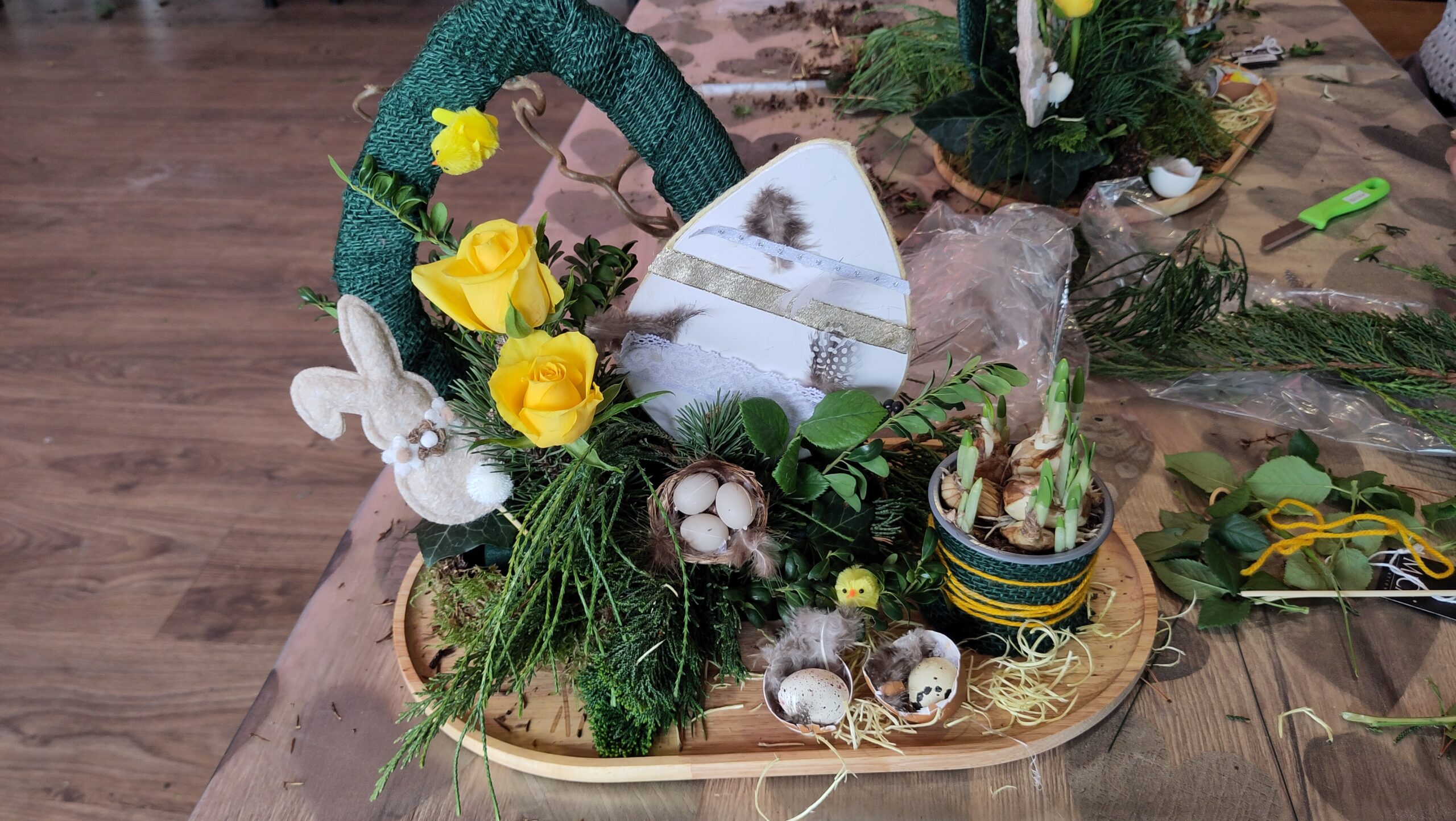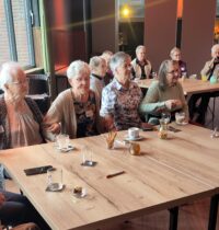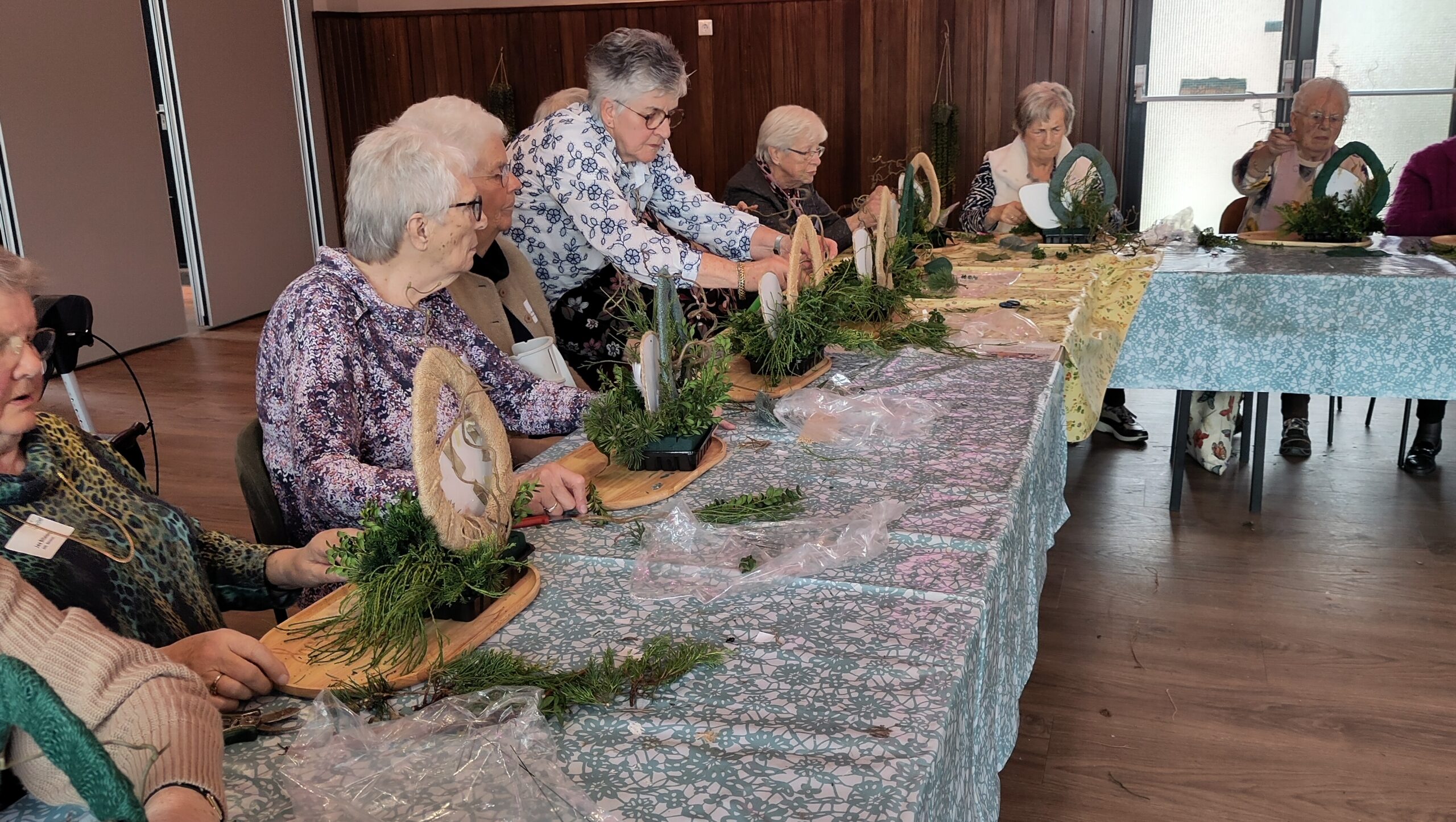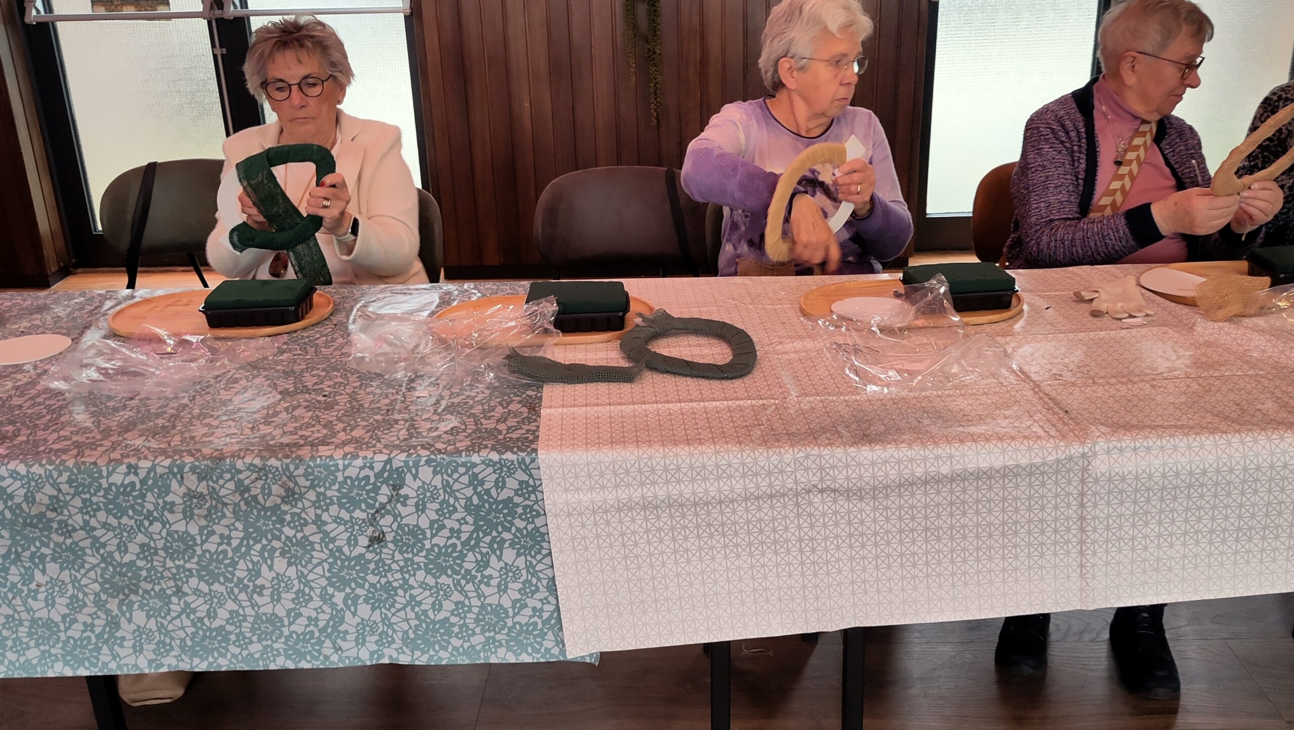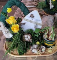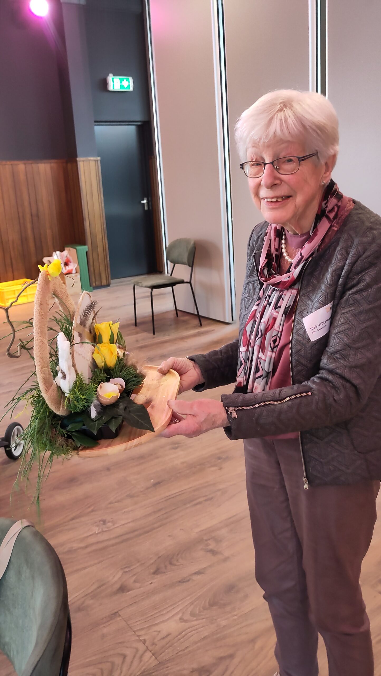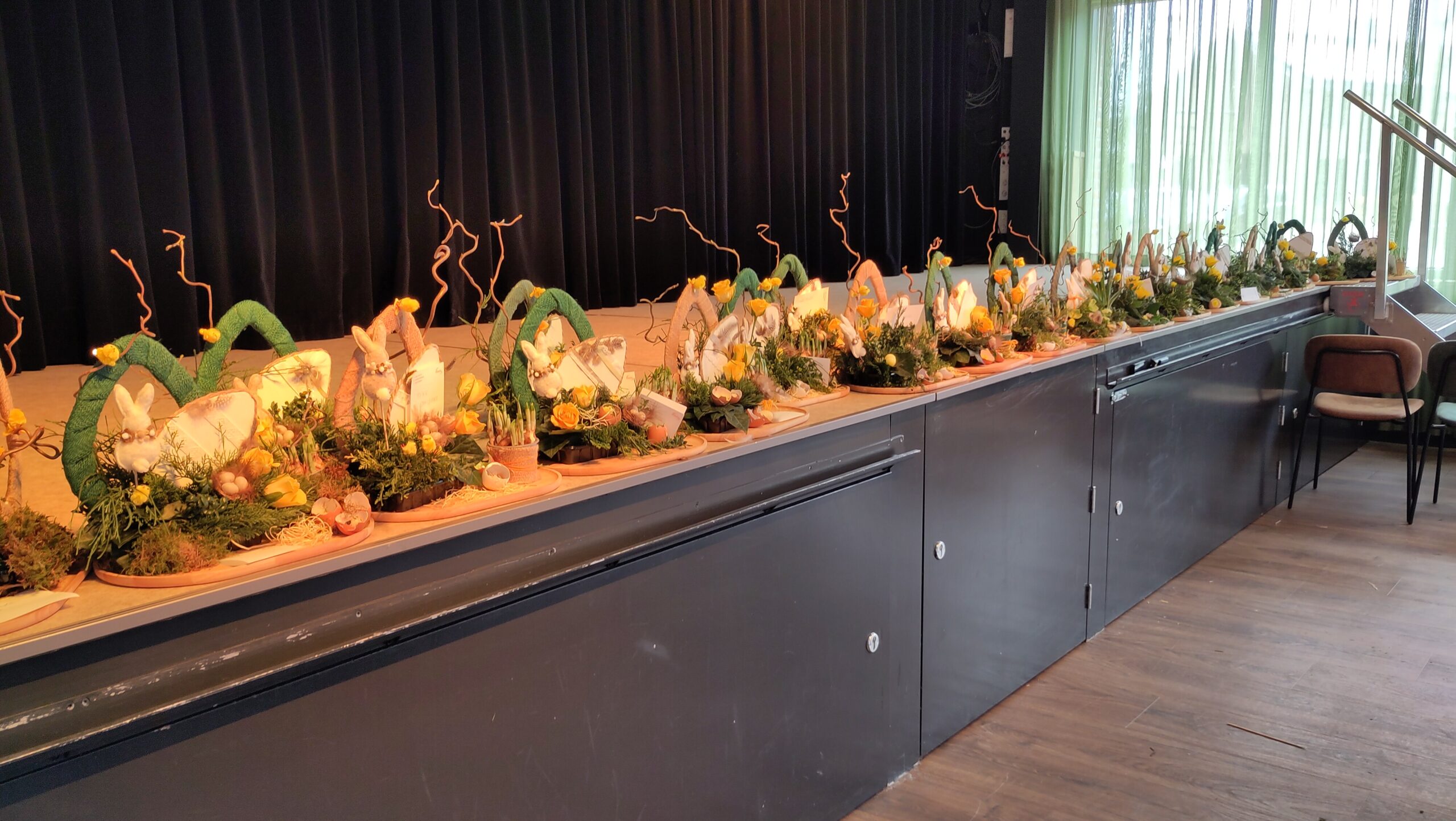 Een fijne dag, beginnend met koffie en vlaai. Daarna aan de slag, want er wordt een paasstuk gemaakt. Aan lange tafels in d’n Oesterham werd had gewerkt, onder deskundige begeleiding van Rieky en Truus. Als alles naar tevredenheid is afgemaakt, en alle stukjes naast elkaar op het podium staan, is het tijd voor de lunch. Ook deze keer weer heerlijk klaargemaakt door de dames van d’n Oesterham, met voor-, hoofd-, en nagerecht, inclusief mini-worstebroodjes!