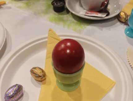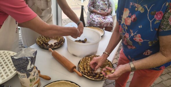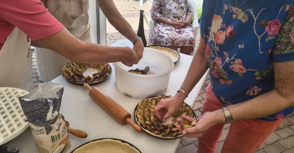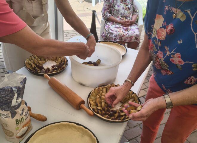 Na het bakken volgde natuurlijk het beste moment van de middag: alles werd gezamenlijk opgegeten, met een kopje koffie of thee erbij. Het eigen gebakken brood en de broodjes met beleg, en voor iedereen was er een stukje vlaai. en volop ruimte voor fijne gesprekken.