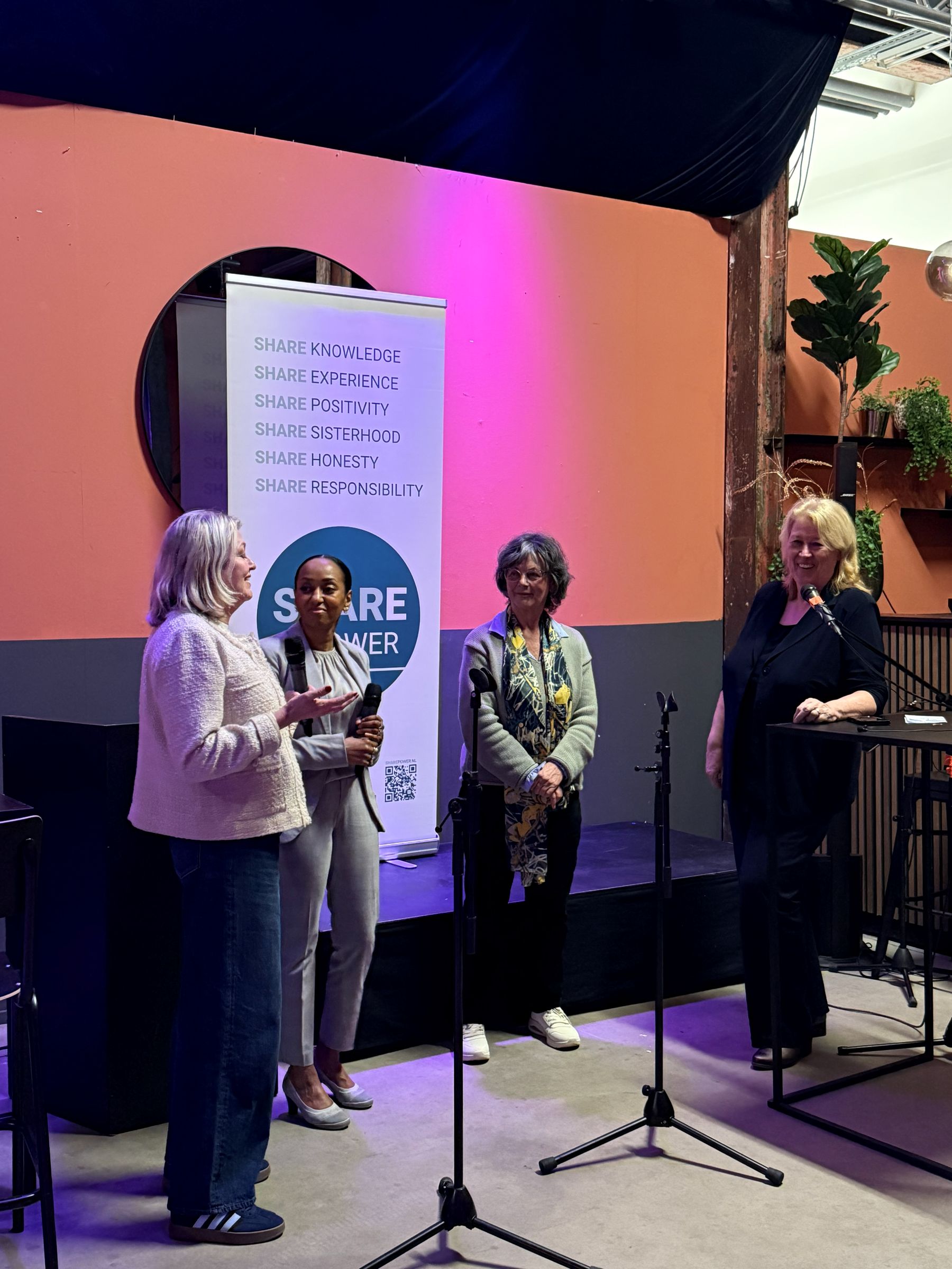 Ook Marianne Smitsmans, voorzitter van SharePower, sprak over de zogeheten kweekvijvertrajecten. Deze trajecten helpen vrouwen die interesse hebben in politiek of bestuur om hun eerste stappen te zetten. Oud-deelnemers Laila Kuiper, Habiba Amzil en Anne Hanssen vertelden hoe het traject hen kennis, zelfvertrouwen en een netwerk heeft gebracht.