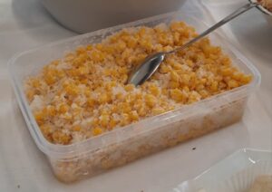 Je stopt de koude mais uit blik in een schaal of iets anders en mengt de gestoomde geraspte kokos daarmee en schepje suiker naar behoefte.