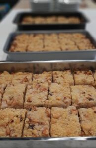 - Haal de kruimels uit de vriezer en verdeel over de appel. Bak de appel plaatcake 55-60 minuten in de oven tot goudbruin en gaar. Laat afkoelen en snijd in stukken. Bestrooi eventueel met wat poedersuiker.