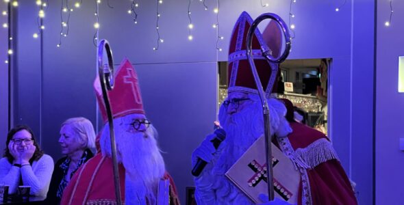 Speculaas en strooigoed lag op de tafels en warme chocolademelk werd geserveerd. Uitbundig – aangevoerd door de voorzitster – werden Sinterklaasliedjes gezongen. Toen kwam Sint Nicolaas de zaal binnen.