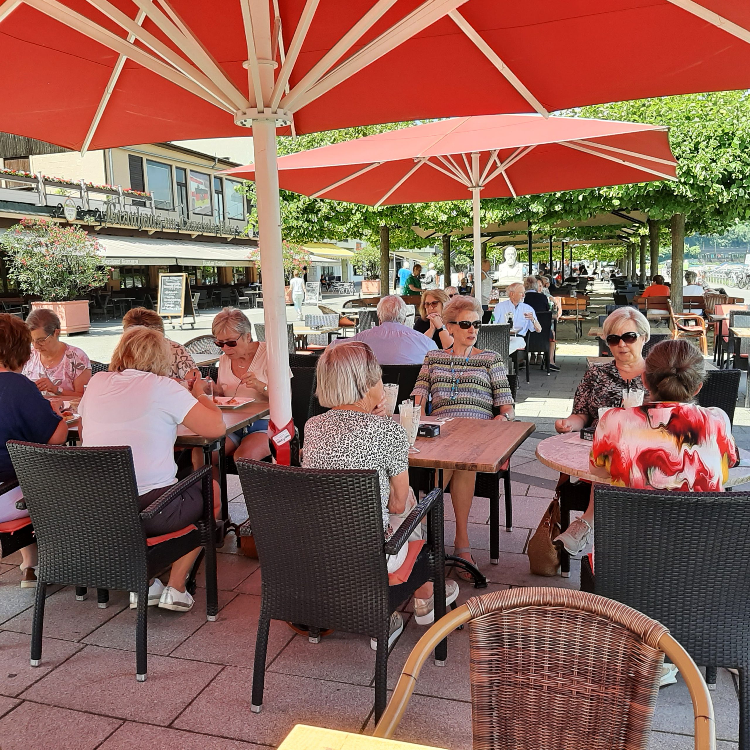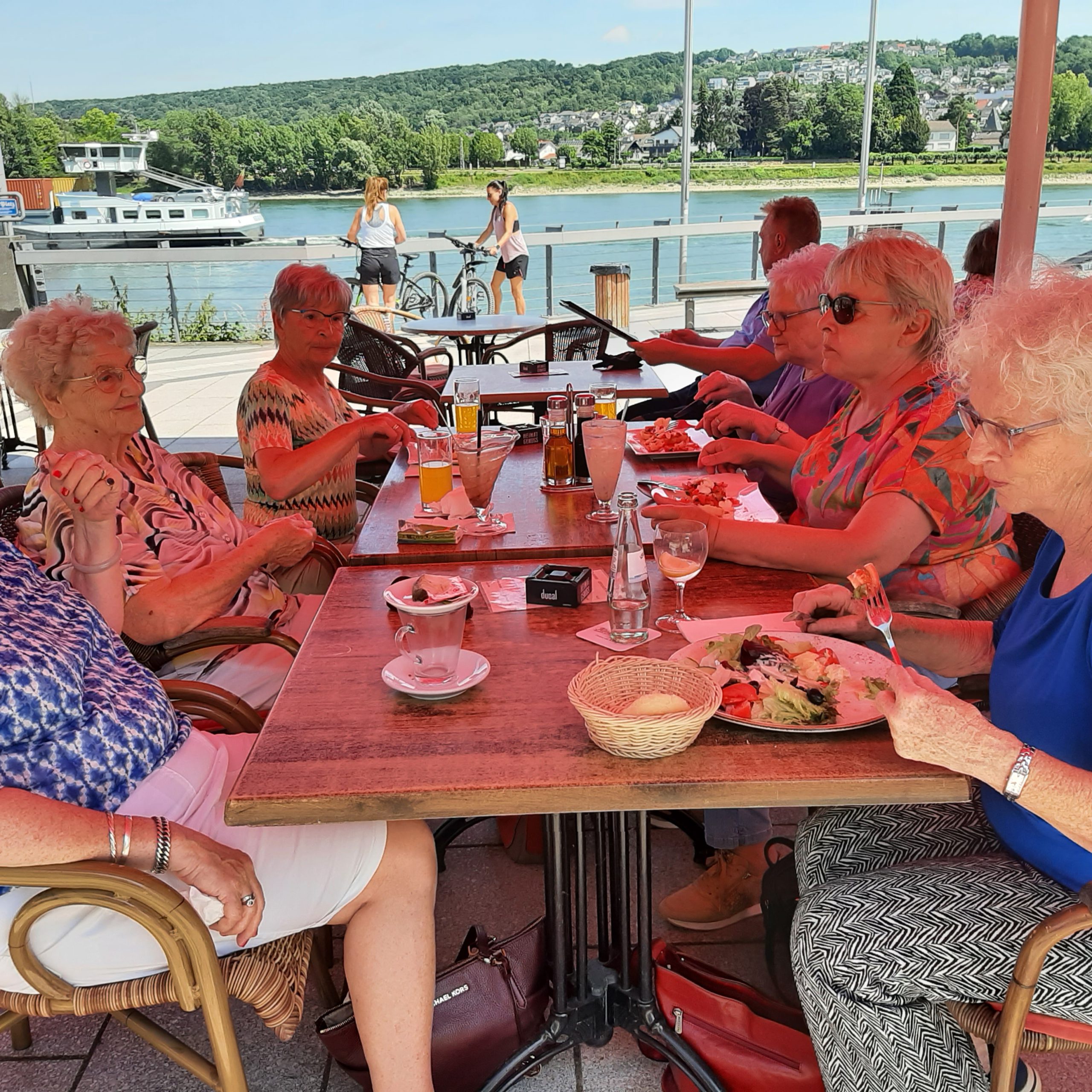 Na een stuk door de mooie Eifel gereden te hebben kwamen we aan in Remagen. Daar hebben de meeste mensen een korte wandeling gemaakt. Een kleine groep heeft de kerk Saint-Apollinaire bezocht. Het was een behoorlijke klim. Na een korte bezichtiging van Remagen zijn we op de terrasjes langs de Rijn gaan zitten waar we iets hebben gedronken c.q. iets hebben gegeten. Het was prachtig weer, dus dit was geen straf.