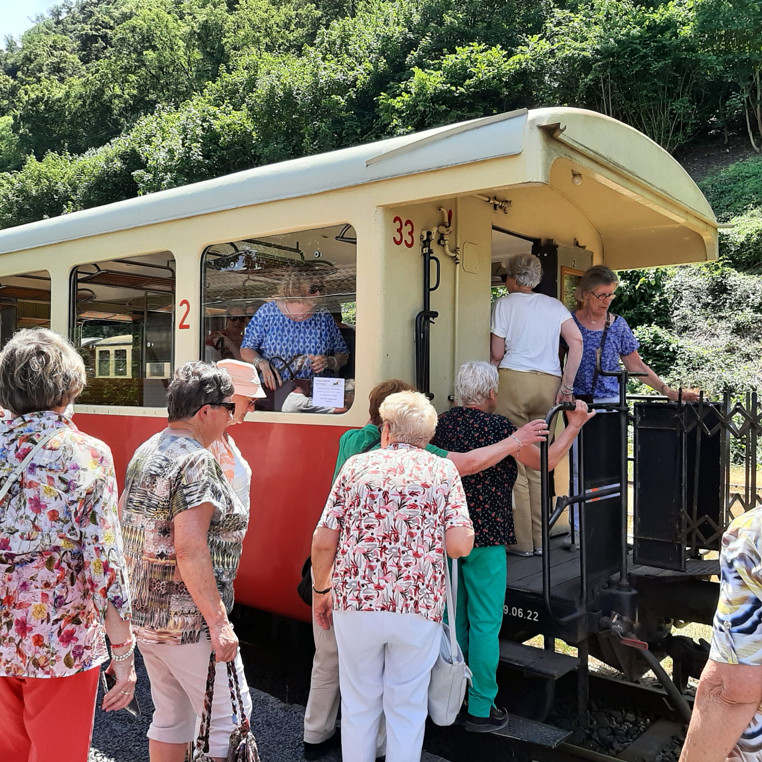 Daarna zijn we weer in de bus gestapt om naar Bröhl te rijden, waar het startpunt van de Vulkan-Express ligt. Na een treintocht van 1,5 uur kwamen we aan in Engel. Het was een leuk tochtje met een oude trein. Helaas geen stoomlocomotief maar een dieseltreintje. Aansluitend zij we weer richting Nederland gereden voor een afsluitend “diner” in Stevensweert.