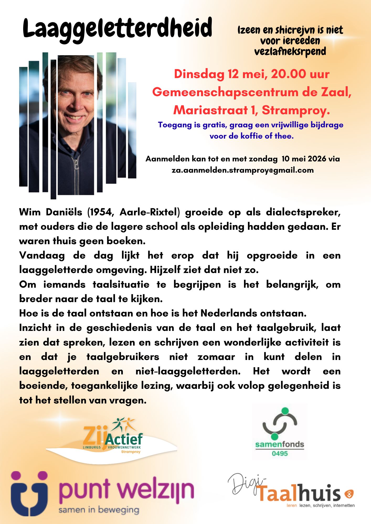 Op dinsdag 12 mei organiseert ZijActief Stramproy een bijzondere avond over het thema laaggeletterdheid. Te gast is Wim Daniëls: schrijver, taalkundige, cabaretier, spreker en tv-presentator. Hij is bij een breed publiek onder meer bekend van het Omroep MAX-programma Het Dorp, waarin hij samen met Huub Stapel op een motor met zijspan door Nederland reist op zoek naar de ziel van het dorp.